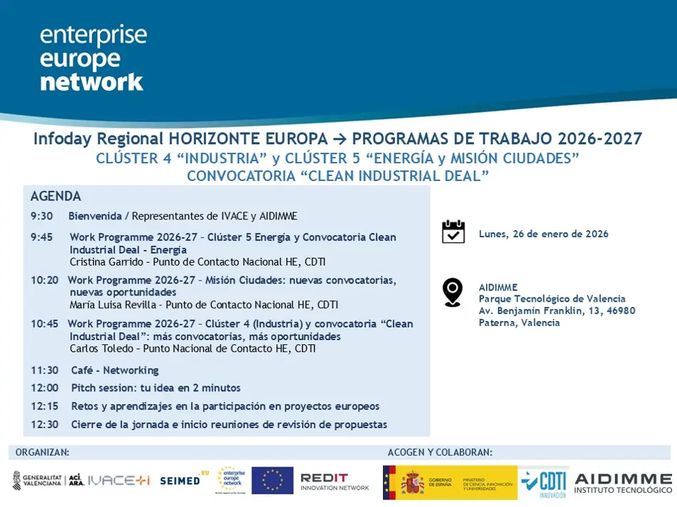 El 26 de enero tendrá lugar una jornada informativa organizada por IVACE, EEN SEIMED y REDIT para presentar las convocatorias 2026-2027 de Horizonte Europa en los ámbitos de Clúster 4 Industria, Clúster 5 Energía, Clean Industrial Deal y Misión de Ciudades. Esta jornada se enmarca en la estrategia de la Generalitat Valenciana de coordinación nacional …